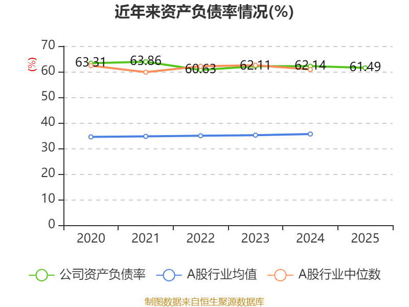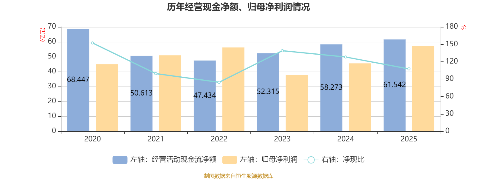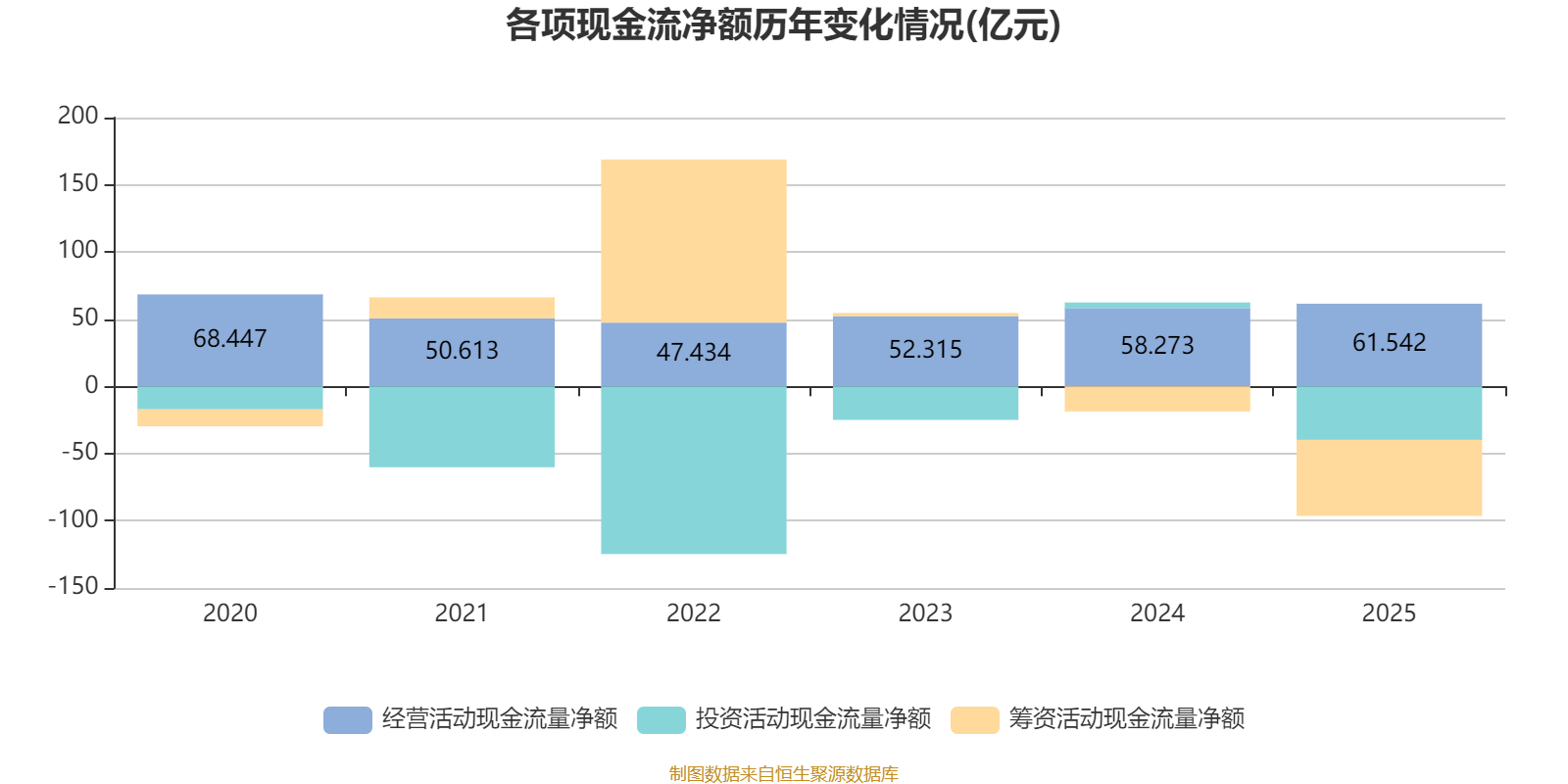 2025年,公司经营活动现金流净额为61.54亿元,同比增长5.61%;筹资活动现金流净额-56.52亿元,同比减少37.88亿元;投资活动现金流净额-39.82亿元,上年同期为4.16亿元。
