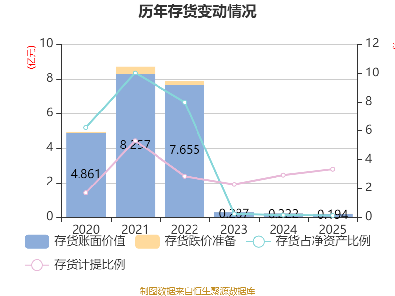 从存货变动来看,截至2025年末,公司存货账面价值为1938.89万元,占净资产的0.12%,较上年末减少276.95万元。其中,存货跌价准备为66.7万元,计提比例为3.33%。