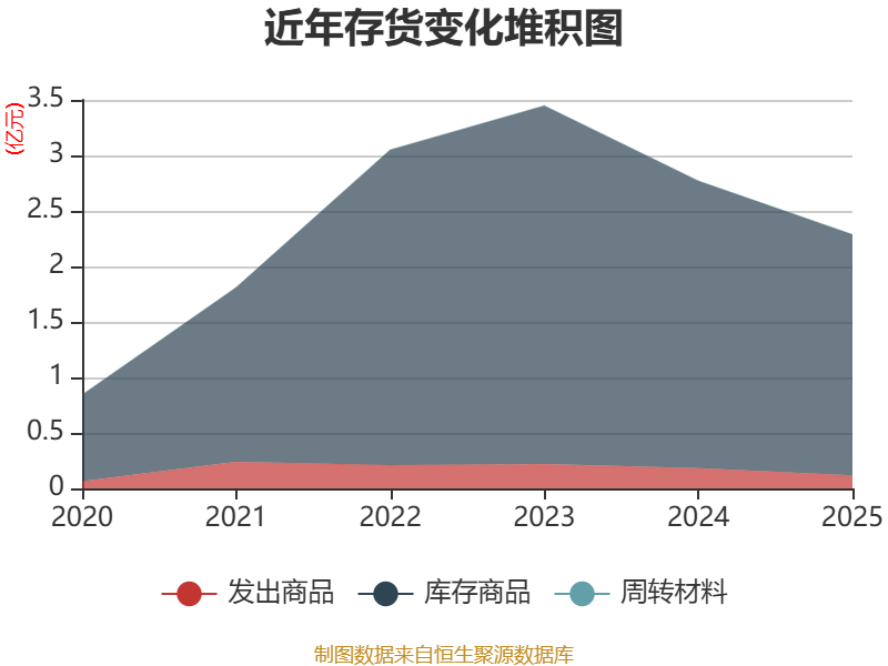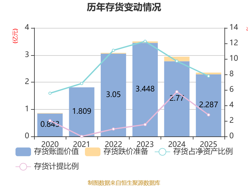 从存货变动来看,截至2025年末,公司存货账面价值为2.29亿元,占净资产的7.78%,较上年末减少4826.31万元。其中,存货跌价准备为655.12万元,计提比例为2.78%。