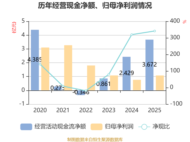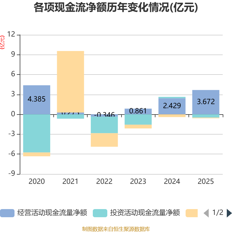 截至2025年,公司经营活动现金流净额为3.67亿元,同比增长51.22%;筹资活动现金流净额-1010.8万元,同比增加3112.94万元;投资活动现金流净额-4925.31万元,上年同期为2068.14万元。