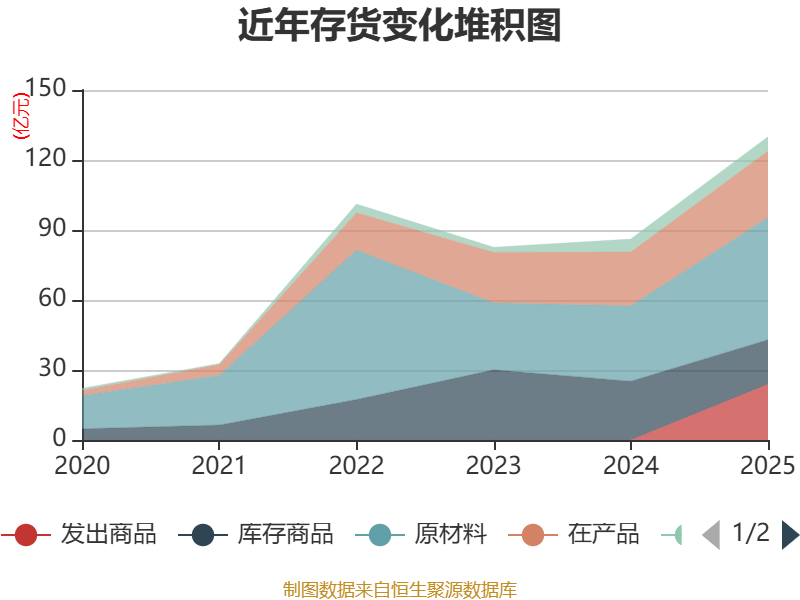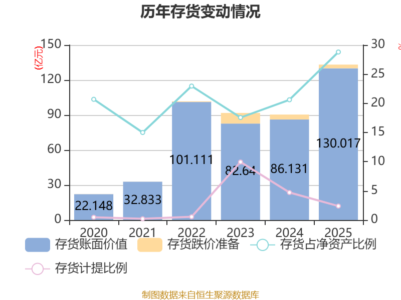 从存货变动来看,截至2025年末,公司存货账面价值为130.02亿元,占净资产的28.8%,较上年末增加43.89亿元。其中,存货跌价准备为3.18亿元,计提比例为2.39%。