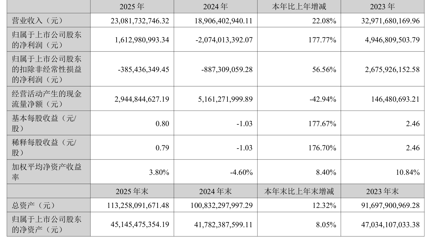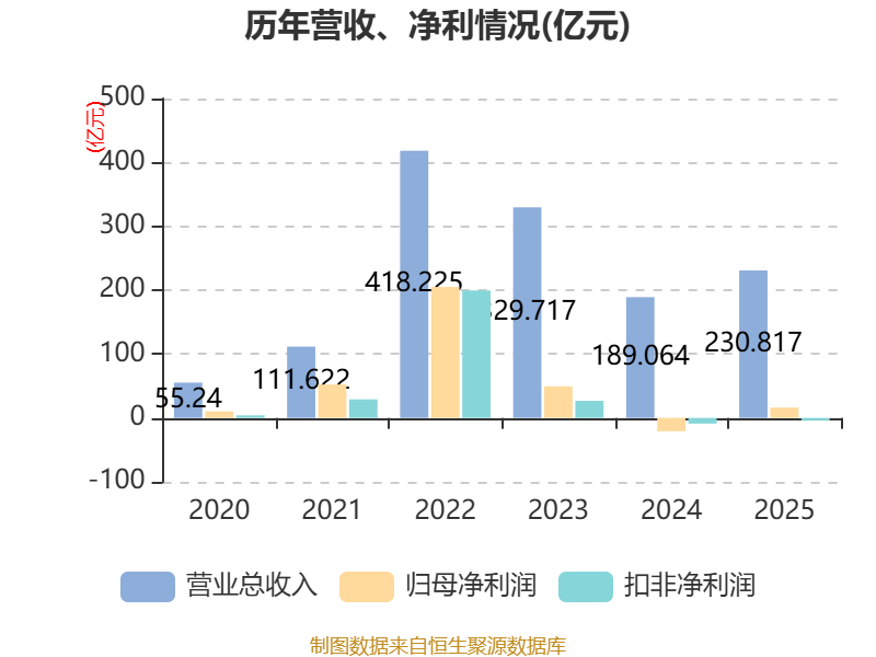 中证智能财讯赣锋锂业(002460)3月31日披露2025年年度报告。2025年,公司实现营业总收入230.82亿元,同比增长22.08%;归母净利润16.13亿元,同比扭亏;扣非净利润亏损3.85亿元,上年同期亏损8.87亿元;经营活动产生的现金流量净额为29.45亿元,同比下降42.94%;报告期内,赣锋锂业基本每股收益为0.8元,加权平均净资产收益率为3.80%。公司2025年度分配预案为:拟向全体股东每10股派现1.5元(含税)。