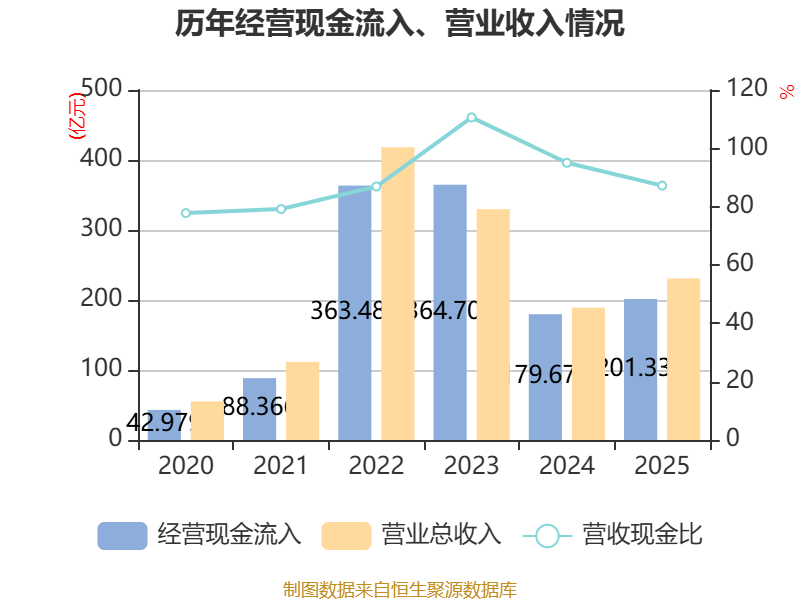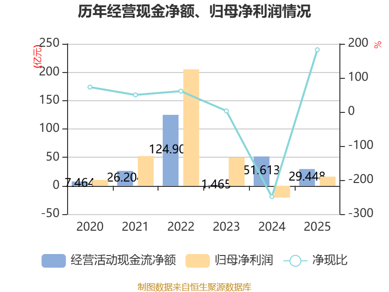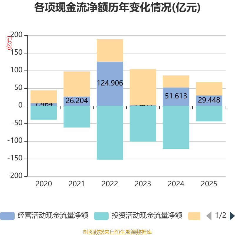 截至2025年,公司经营活动现金流净额为29.45亿元,同比下降42.94%;筹资活动现金流净额37.2亿元,同比增加2.73亿元;投资活动现金流净额-44.07亿元,上年同期为-122.42亿元。