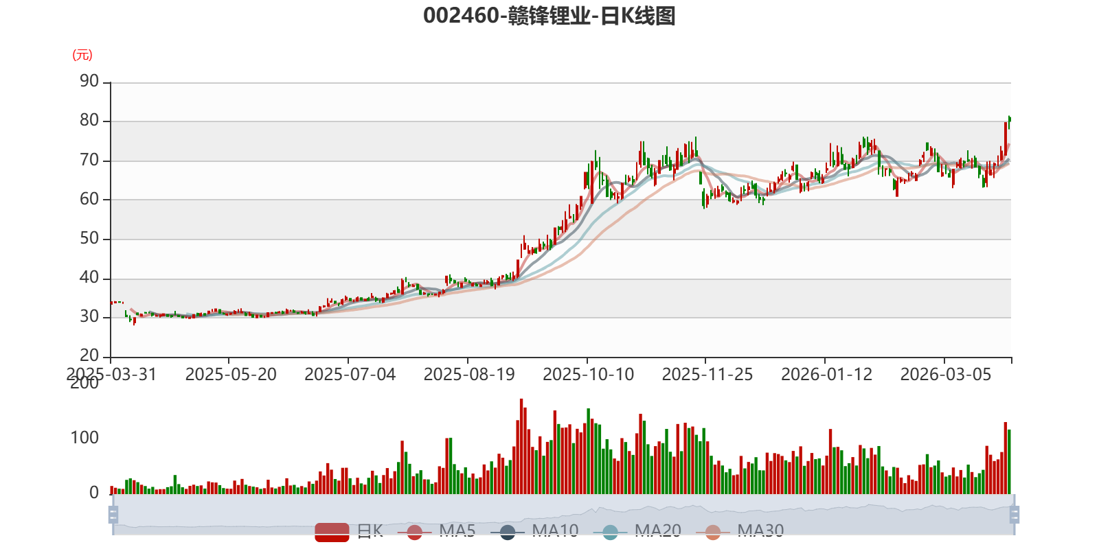 以3月30日收盘价计算,赣锋锂业目前市盈率(TTM)约为104.19倍,市净率(LF)约3.72倍,市销率(TTM)约7.28倍。