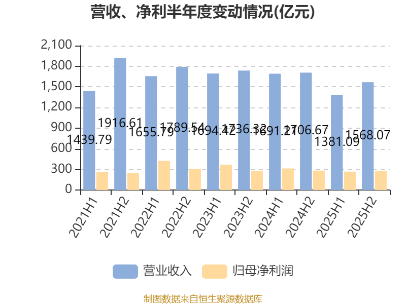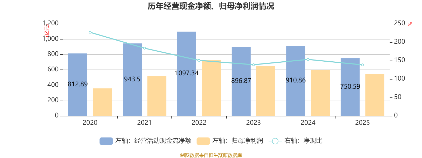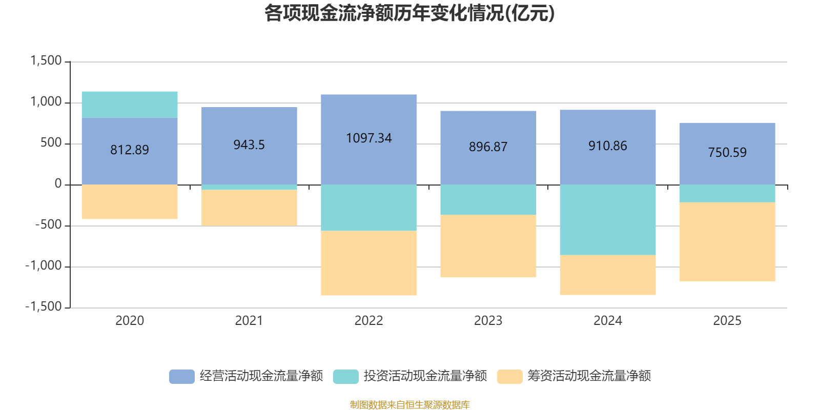 2025年,公司经营活动现金流净额为750.59亿元,同比下降17.6%;筹资活动现金流净额-962.42亿元,同比减少476.52亿元;投资活动现金流净额-217.94亿元,上年同期为-860.95亿元。