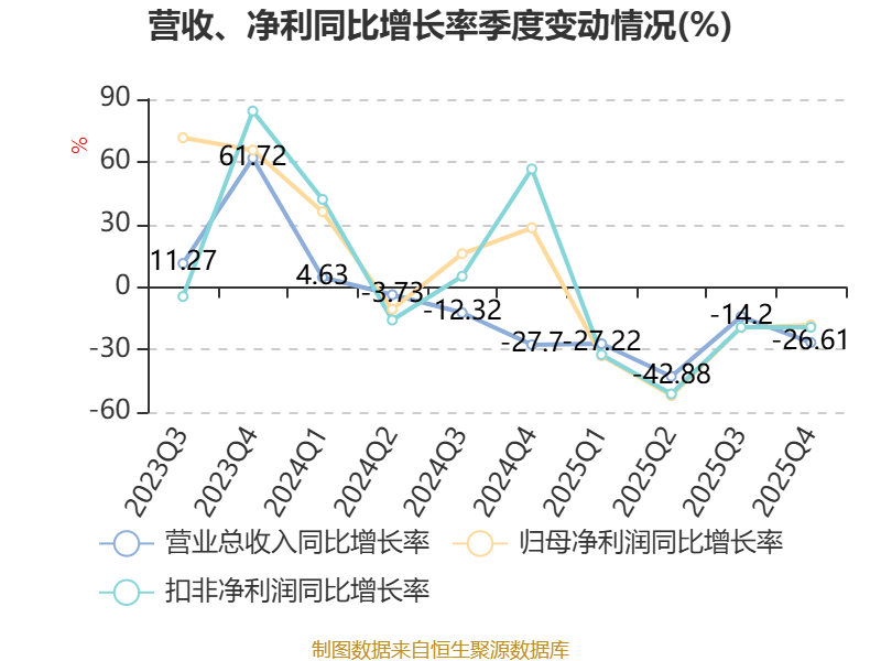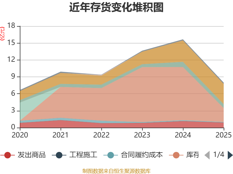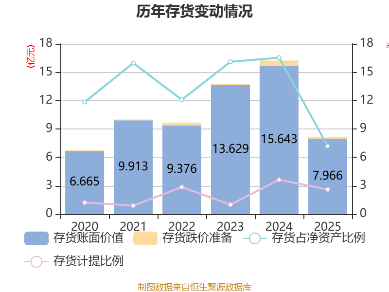 从存货变动来看,截至2025年末,公司存货账面价值为7.97亿元,占净资产的7.18%,较上年末减少7.68亿元。其中,存货跌价准备为2136.1万元,计提比例为2.61%。