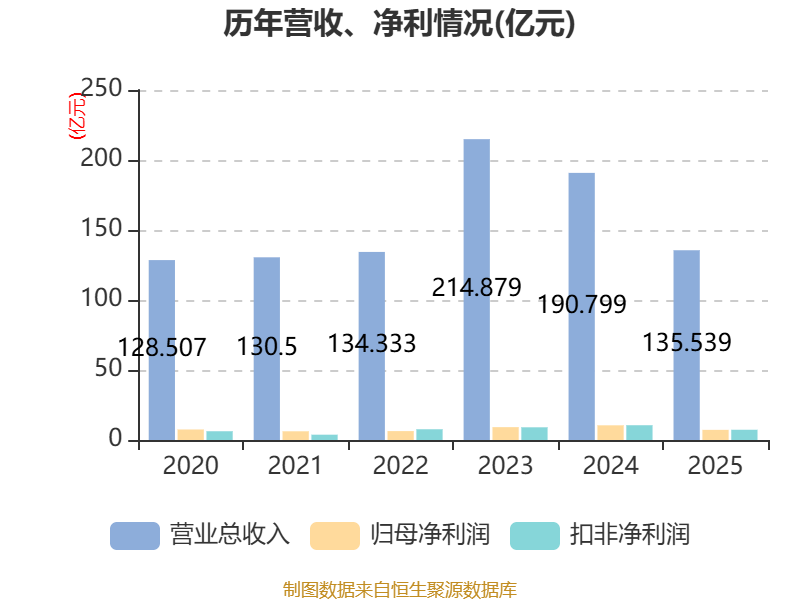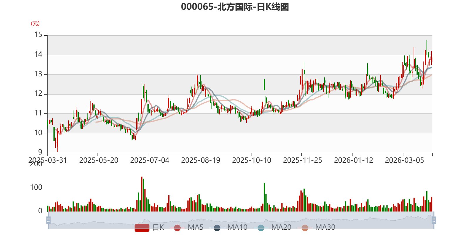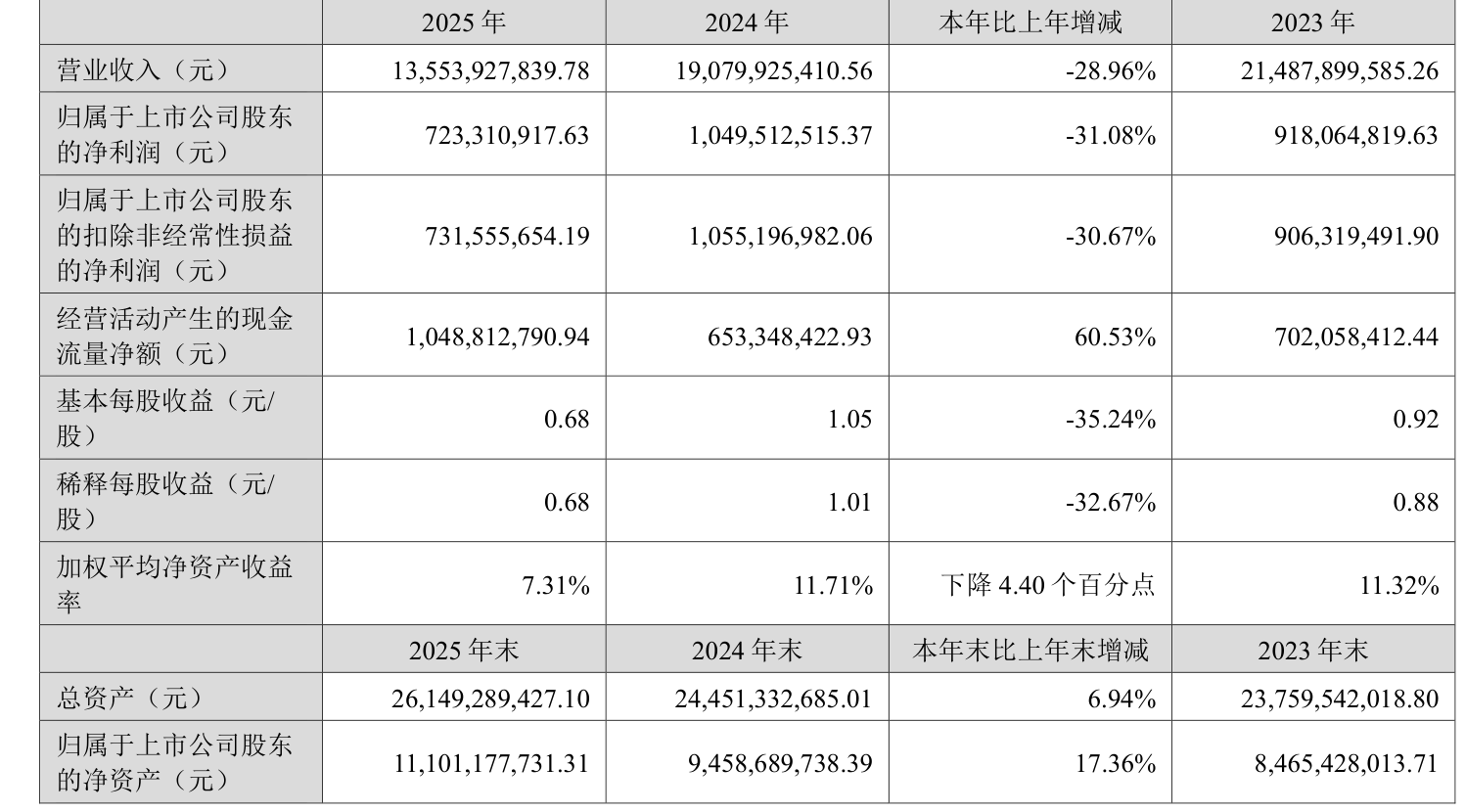 中证智能财讯北方国际(000065)3月31日披露2025年年度报告。2025年,公司实现营业总收入135.54亿元,同比下降28.96%;归母净利润7.23亿元,同比下降31.08%;扣非净利润7.32亿元,同比下降30.67%;经营活动产生的现金流量净额为10.49亿元,同比增长60.53%;报告期内,北方国际基本每股收益为0.68元,加权平均净资产收益率为7.31%。公司2025年度分配预案为:拟向全体股东每10股派现1.37元(含税)。
