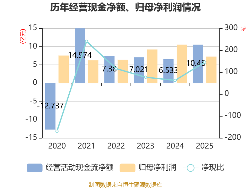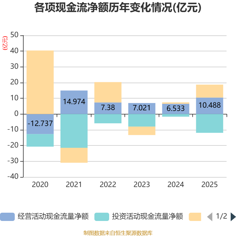 截至2025年,公司经营活动现金流净额为10.49亿元,同比增长60.53%;筹资活动现金流净额8.23亿元,同比增加7.33亿元;投资活动现金流净额-11.92亿元,上年同期为-1.67亿元。