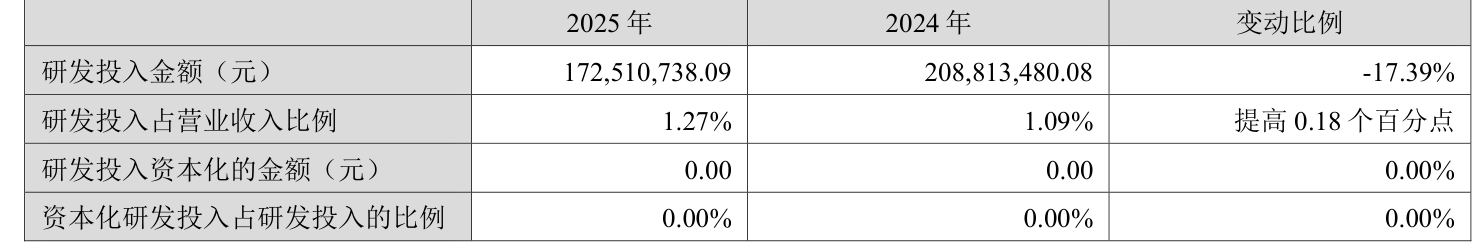 2025年全年,公司研发投入金额为1.73亿元,同比下降17.39%;研发投入占营业收入比例为1.27%,相比上年同期上升0.18个百分点。此外,公司全年研发投入资本化率为0%。