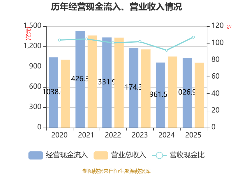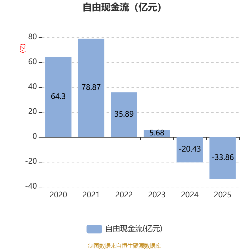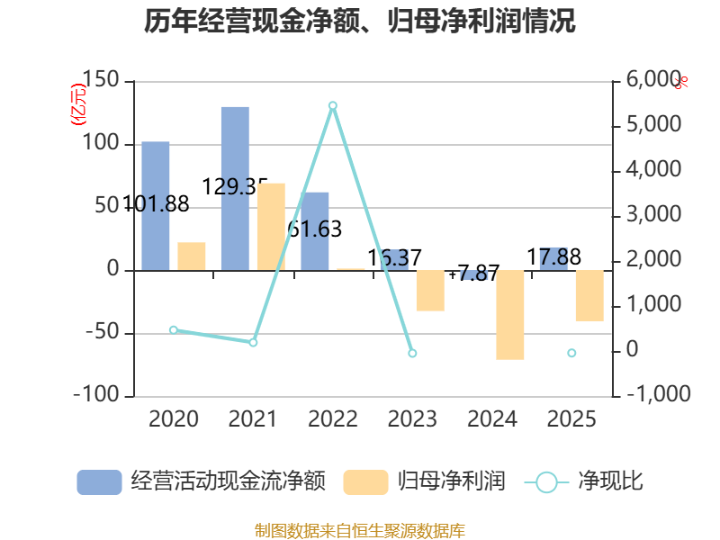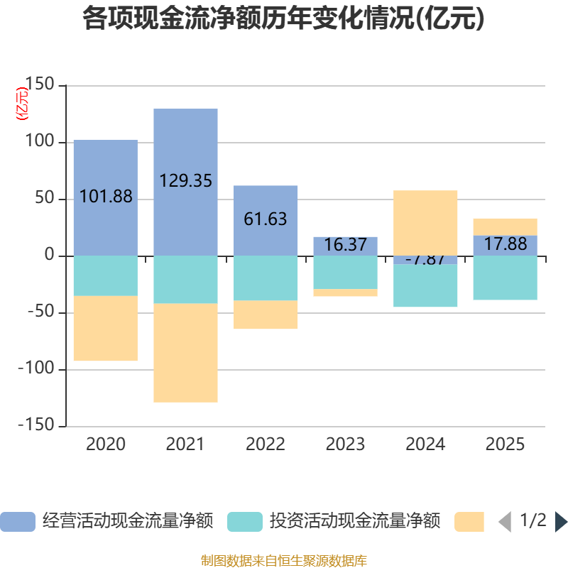 截至2025年,公司经营活动现金流净额为17.88亿元,同比增加25.75亿元;筹资活动现金流净额14.71亿元,同比减少42.68亿元;投资活动现金流净额-38.99亿元,上年同期为-37.27亿元。