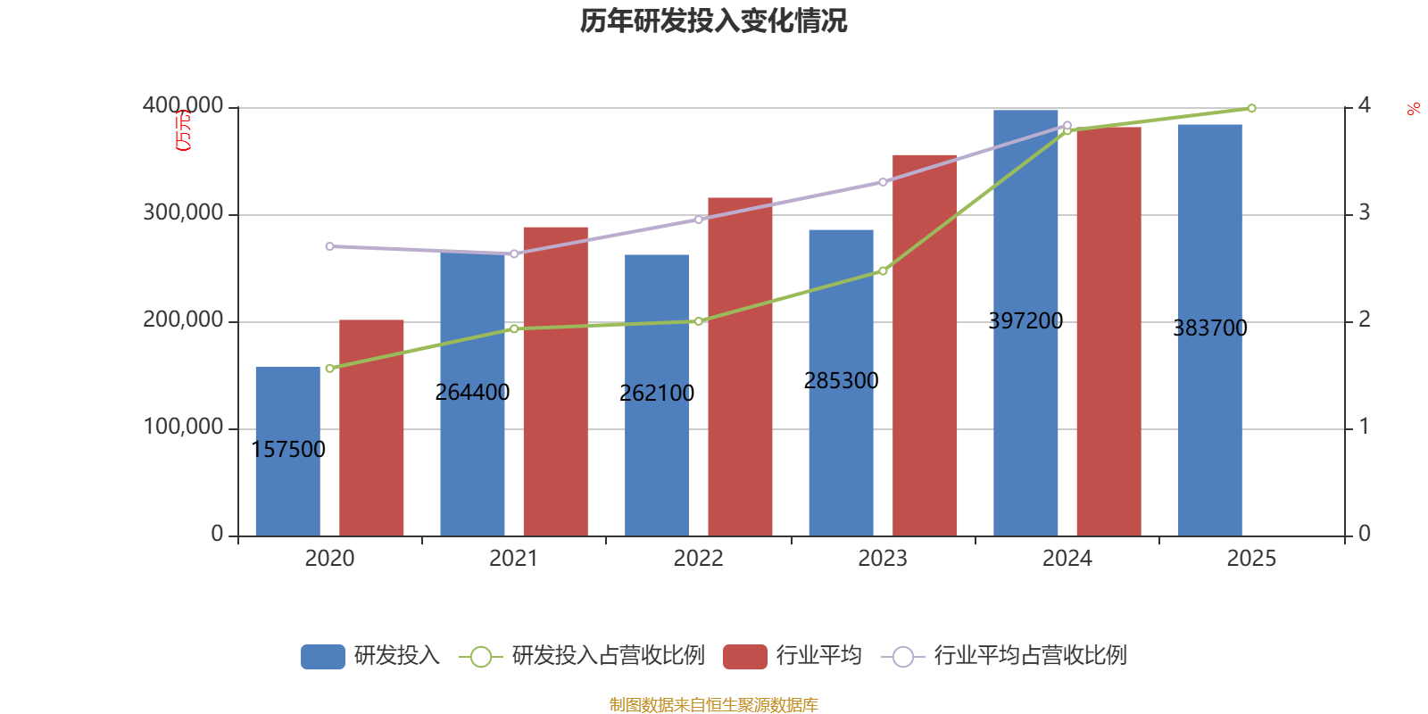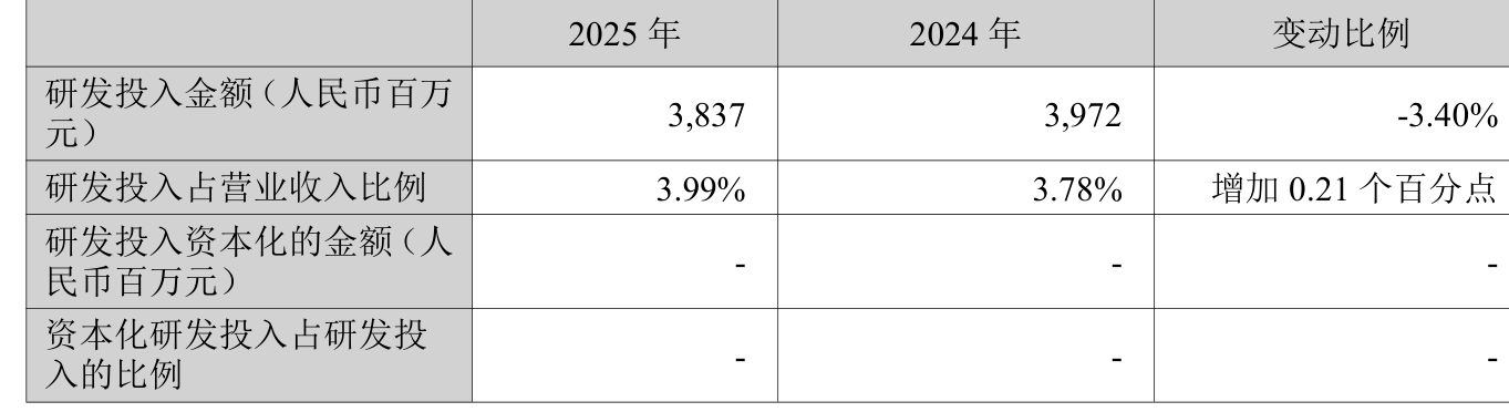 2025年全年,公司研发投入金额为38.37亿元,同比下降3.4%;研发投入占营业收入比例为3.99%,相比上年同期上升0.21个百分点。