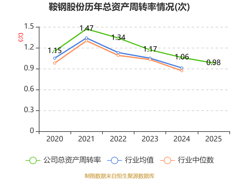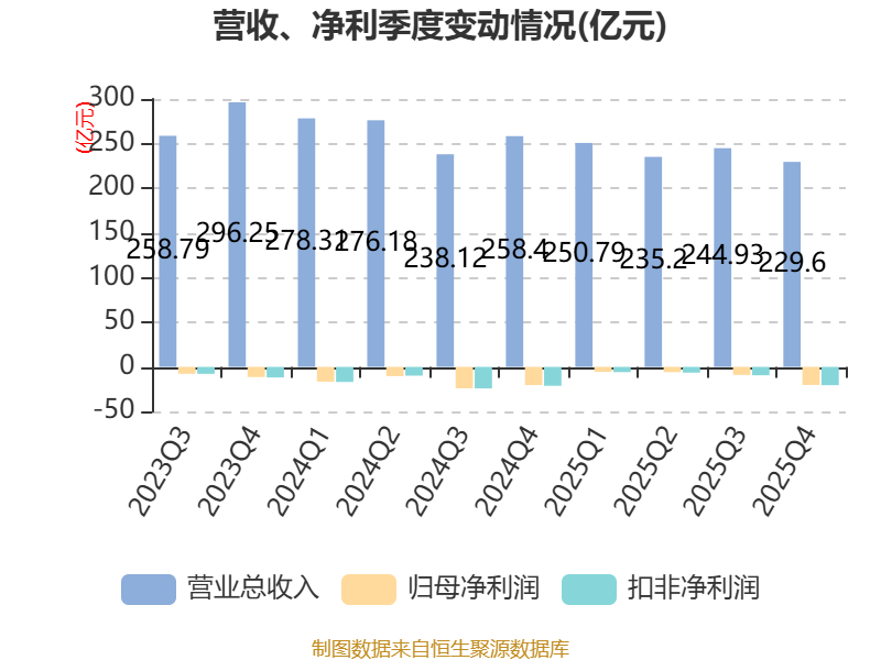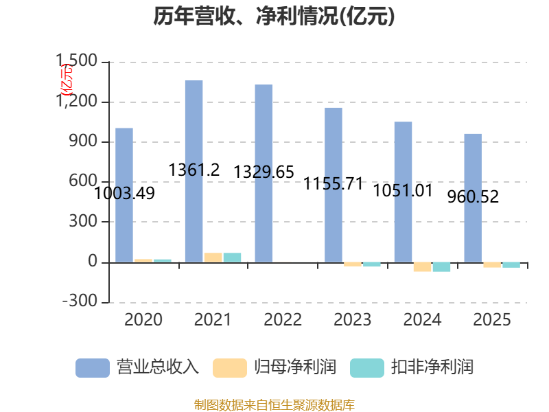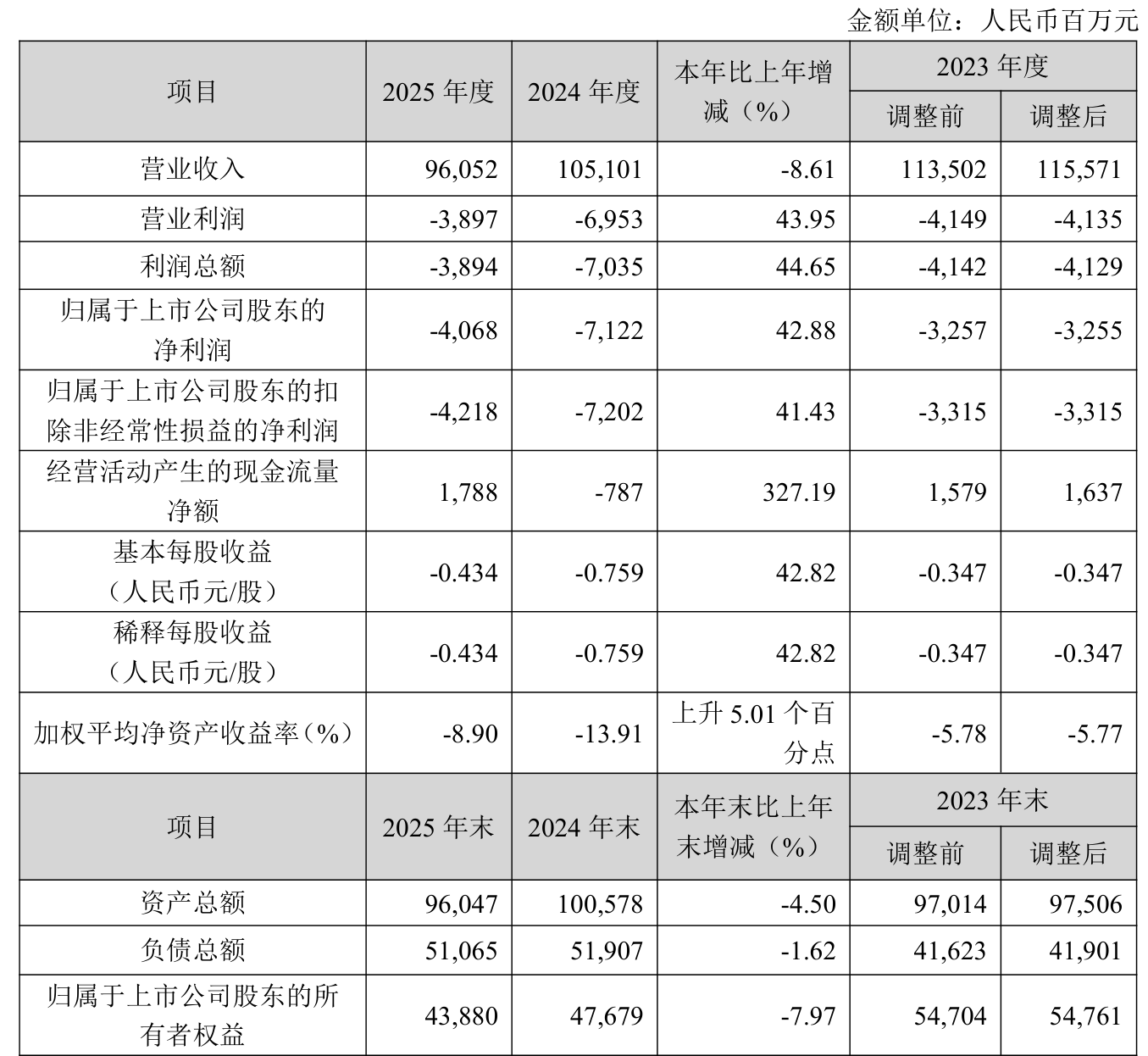 中证智能财讯鞍钢股份(000898)3月31日披露2025年年度报告。2025年,公司实现营业总收入960.52亿元,同比下降8.61%;归母净利润亏损40.68亿元,上年同期亏损71.22亿元;扣非净利润亏损42.18亿元,上年同期亏损72.02亿元;经营活动产生的现金流量净额为17.88亿元,上年同期为-7.87亿元;报告期内,鞍钢股份基本每股收益为-0.434元,加权平均净资产收益率为-8.90%。