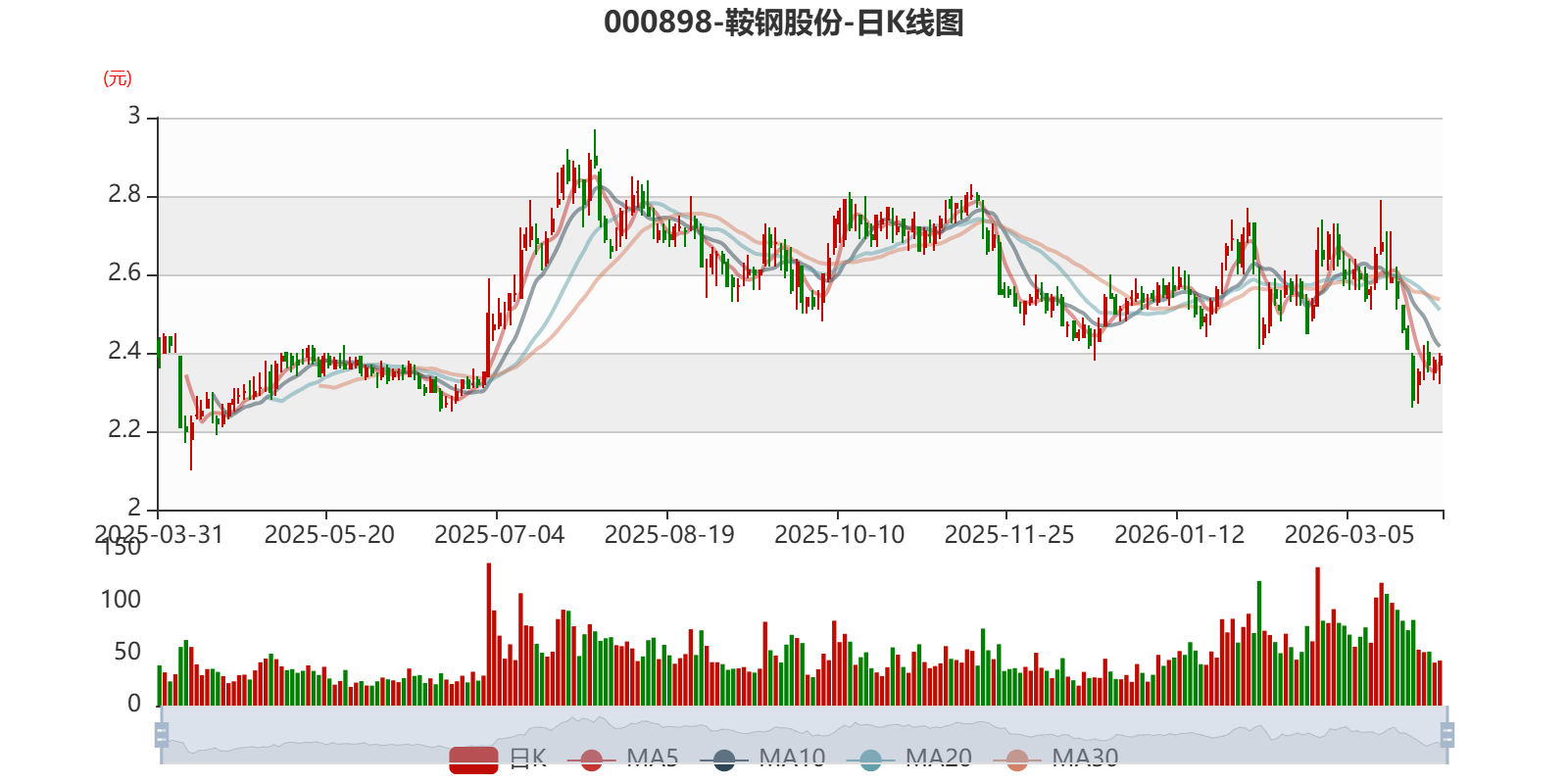 以3月30日收盘价计算,鞍钢股份目前市盈率(TTM)约为-5.5倍,市净率(LF)约0.51倍,市销率(TTM)约0.23倍。