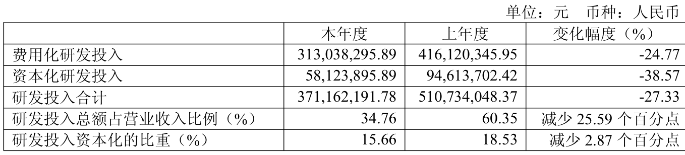 2025年全年,公司研发投入金额为3.71亿元,同比下降27.33%;研发投入占营业收入比例为34.76%,相比上年同期下降25.59个百分点。此外,公司全年研发投入资本化率为15.66%。