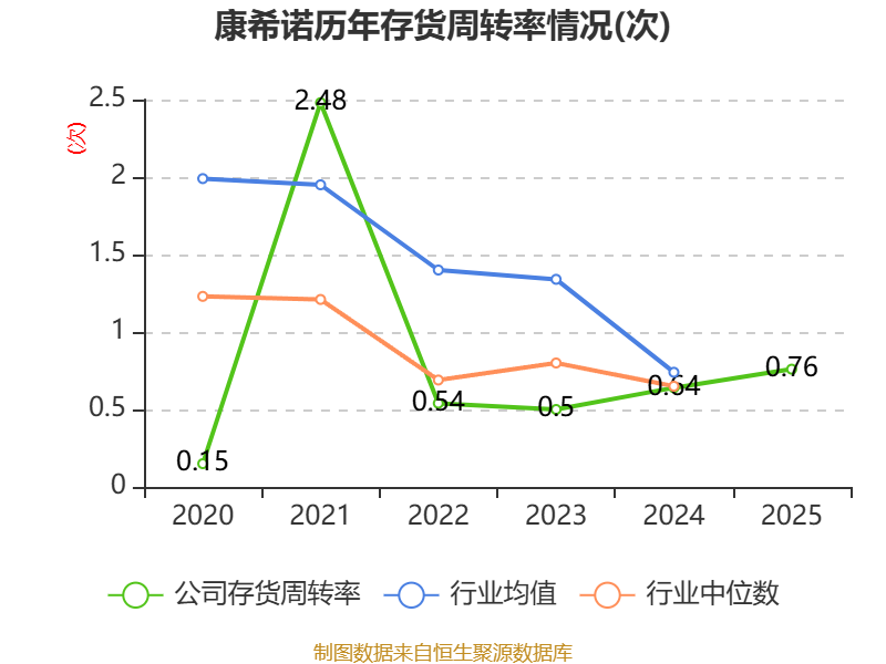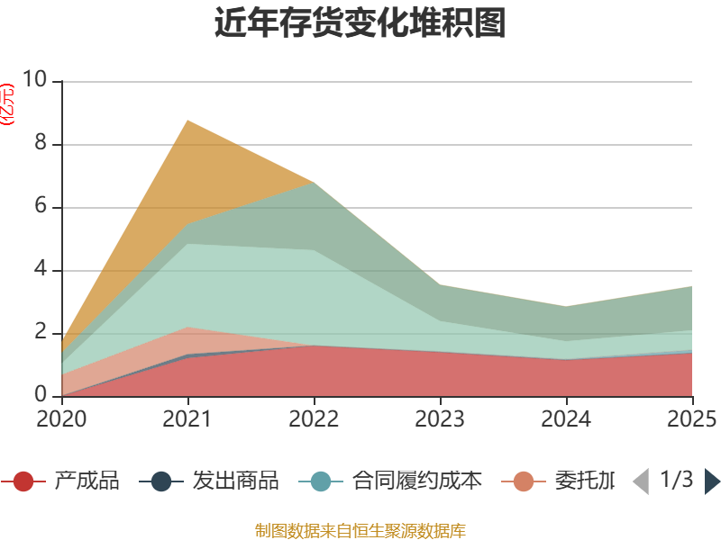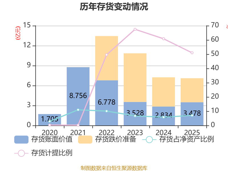 从存货变动来看,截至2025年末,公司存货账面价值为3.48亿元,占净资产的7.02%,较上年末增加6443.36万元。其中,存货跌价准备为3.61亿元,计提比例为50.96%。