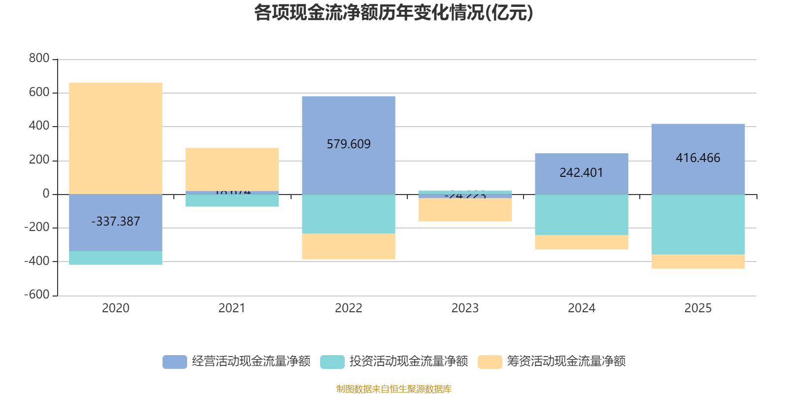 2025年,公司经营活动现金流净额为416.47亿元,同比增长71.81%;筹资活动现金流净额-84.41亿元,同比减少4344.28万元;投资活动现金流净额-357.14亿元,上年同期为-243.13亿元。