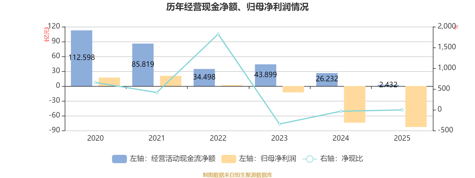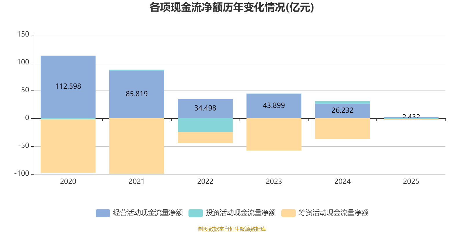 2025年,公司经营活动现金流净额为2.43亿元,同比下降90.73%;筹资活动现金流净额-1.22亿元,同比增加36.03亿元;投资活动现金流净额-1.34亿元,上年同期为4.66亿元。