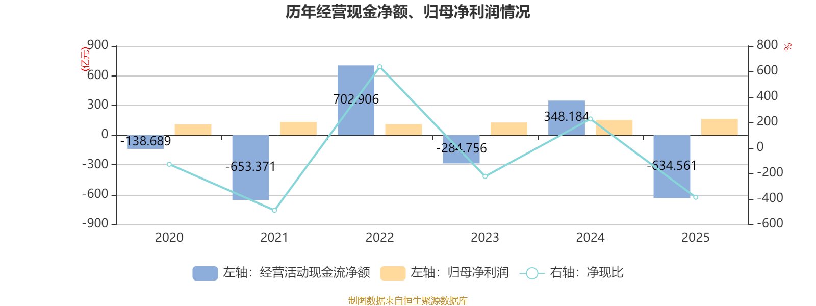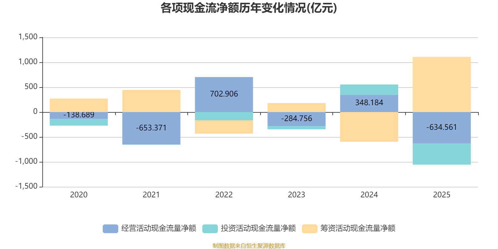 2025年,公司经营活动现金流净额为-634.56亿元,同比减少982.75亿元;筹资活动现金流净额1107.9亿元,同比增加1704.61亿元;投资活动现金流净额-421.02亿元,上年同期为204.96亿元。