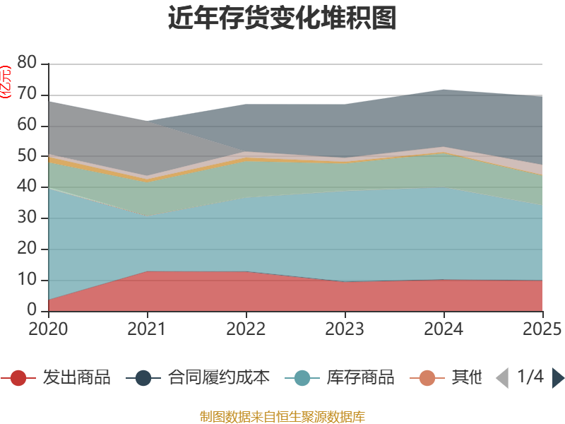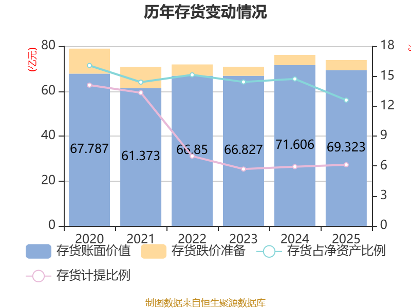 从存货变动来看,截至2025年末,公司存货账面价值为69.32亿元,占净资产的12.6%,较上年末减少2.28亿元。其中,存货跌价准备为4.52亿元,计提比例为6.12%。