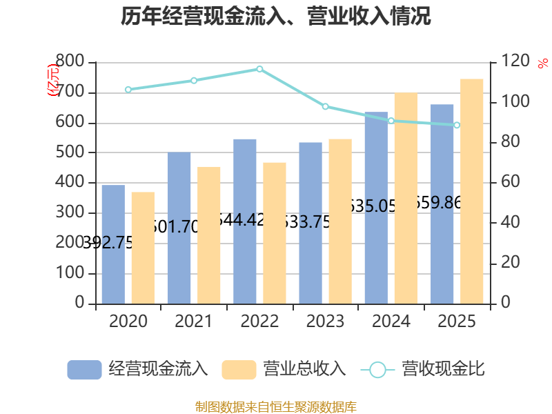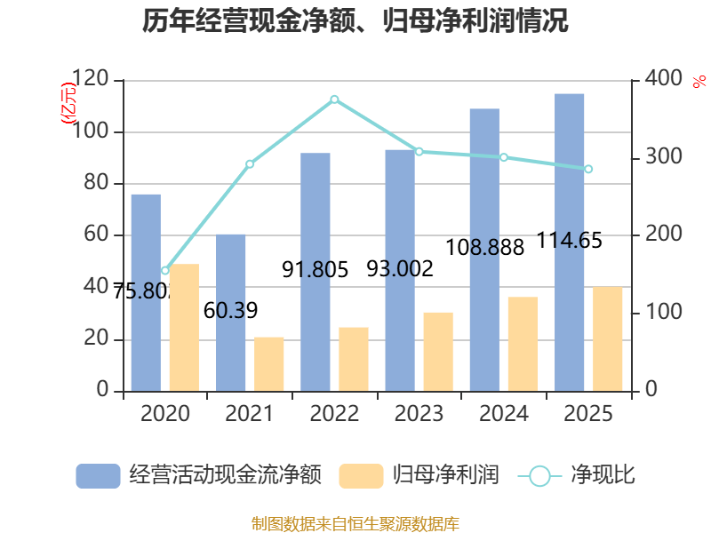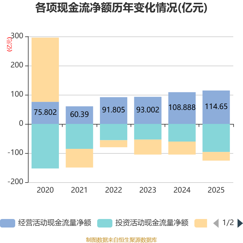 截至2025年,公司经营活动现金流净额为114.65亿元,同比增长5.29%;筹资活动现金流净额-29.64亿元,同比增加14.91亿元;投资活动现金流净额-96.17亿元,上年同期为-60.5亿元。