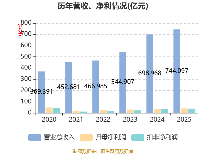 中证智能财讯蓝思科技(300433)3月31日披露2025年年度报告。2025年,公司实现营业总收入744.1亿元,同比增长6.46%;归母净利润40.18亿元,同比增长10.87%;扣非净利润38.35亿元,同比增长16.71%;经营活动产生的现金流量净额为114.65亿元,同比增长5.29%;报告期内,蓝思科技基本每股收益为0.79元,加权平均净资产收益率为7.82%。公司2025年度分配预案为:拟向全体股东每10股派现4.5元(含税)。