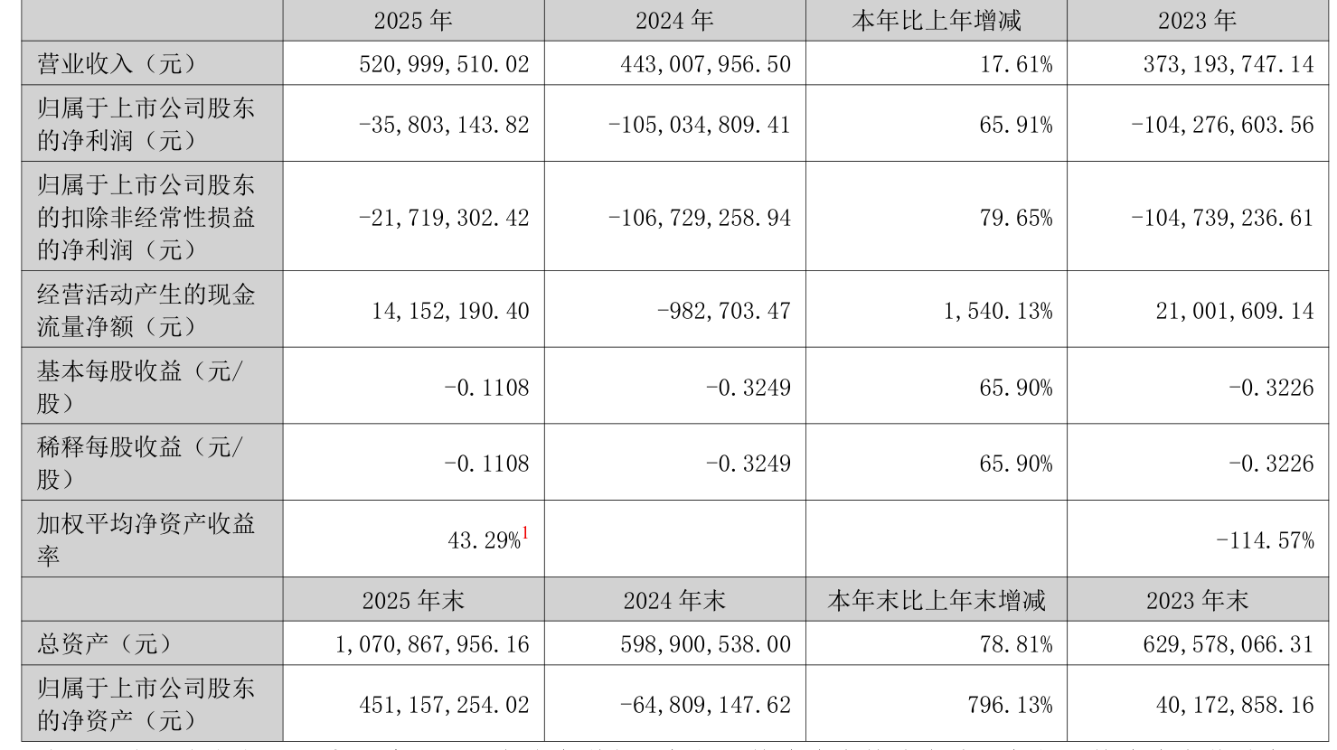 中证智能财讯 *ST亚太(000691)3月31日披露2025年年度报告。2025年,公司实现营业总收入5.21亿元,同比增长17.61%;归母净利润亏损3580.31万元,上年同期亏损1.05亿元;扣非净利润亏损2171.93万元,上年同期亏损1.07亿元;经营活动产生的现金流量净额为1415.22万元,上年同期为-98.27万元;报告期内,*ST亚太基本每股收益为-0.1108元,加权平均净资产收益率为43.29%。
