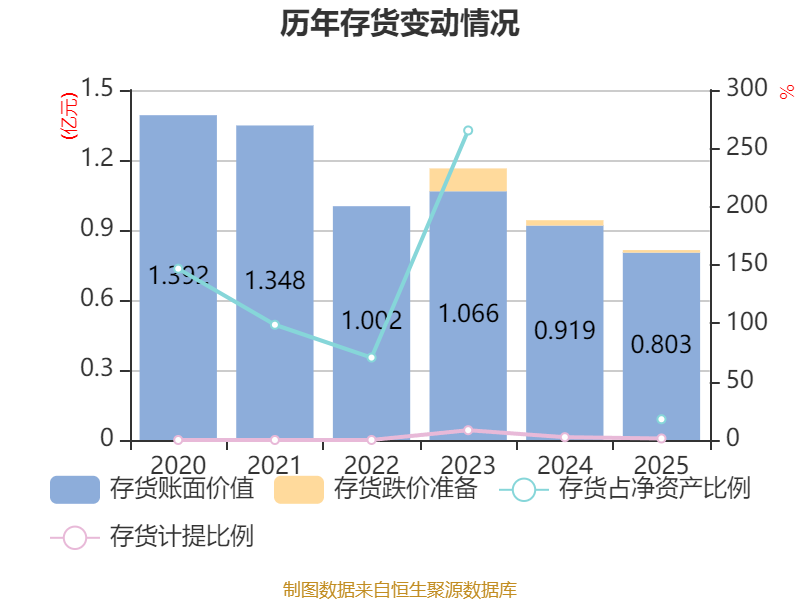 从存货变动来看,截至2025年末,公司存货账面价值为8031.49万元,占净资产的17.8%,较上年末减少1158.4万元。其中,存货跌价准备为106.5万元,计提比例为1.31%。