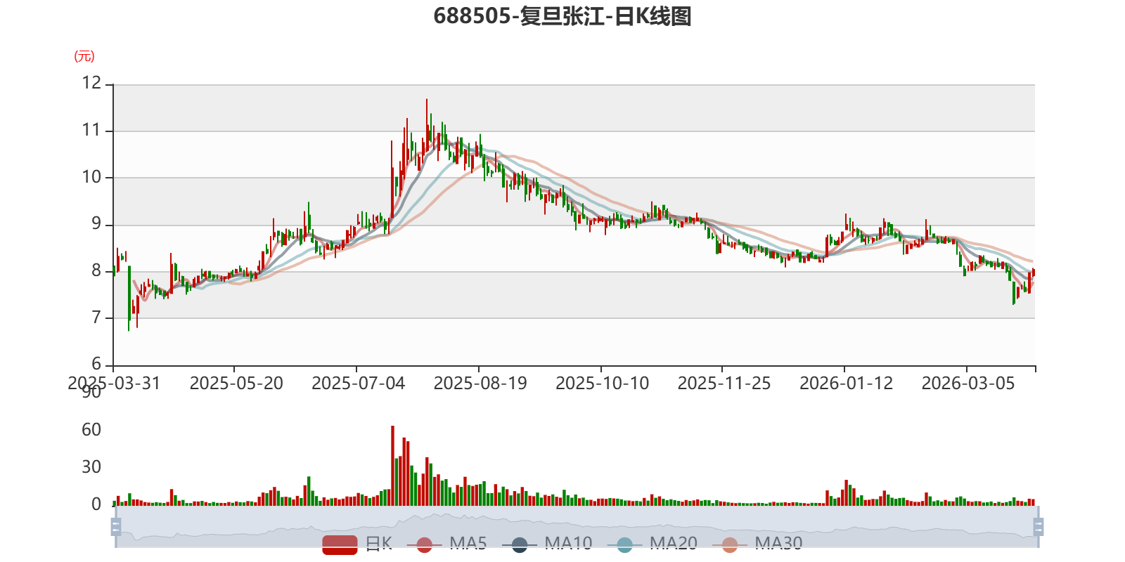 以3月30日收盘价计算,复旦张江目前市盈率(TTM)约为-52.93倍,市净率(LF)约3.94倍,市销率(TTM)约12.15倍。