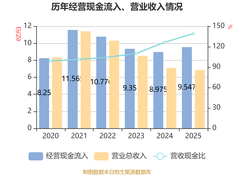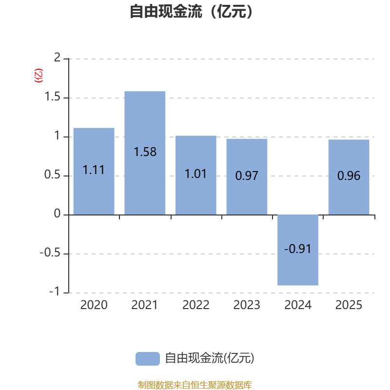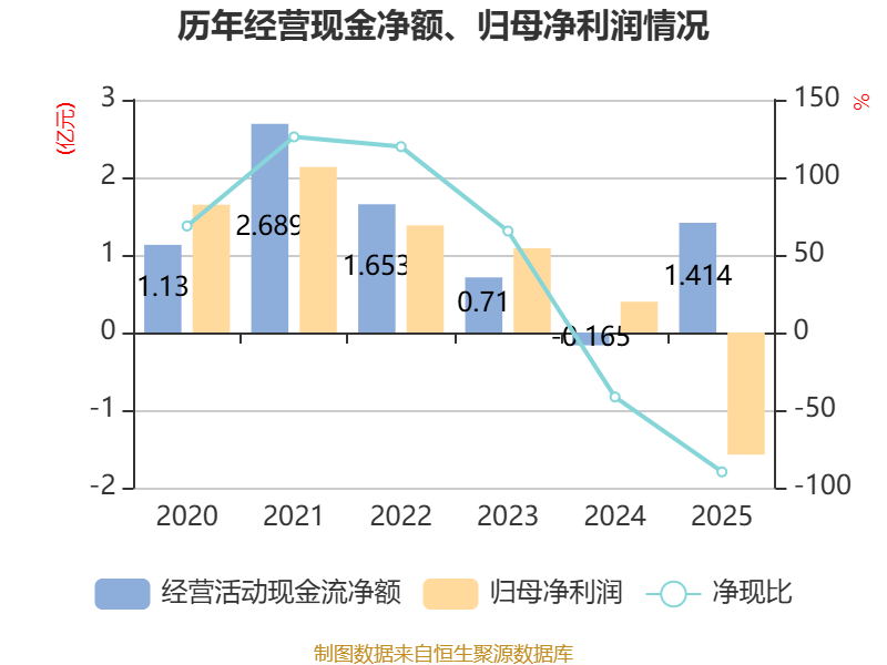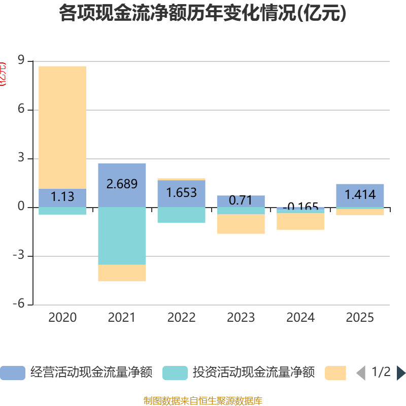 截至2025年,公司经营活动现金流净额为1.41亿元,同比增加1.58亿元;筹资活动现金流净额-3790.61万元,同比增加6336.72万元;投资活动现金流净额-1220.59万元,上年同期为-2213.99万元。