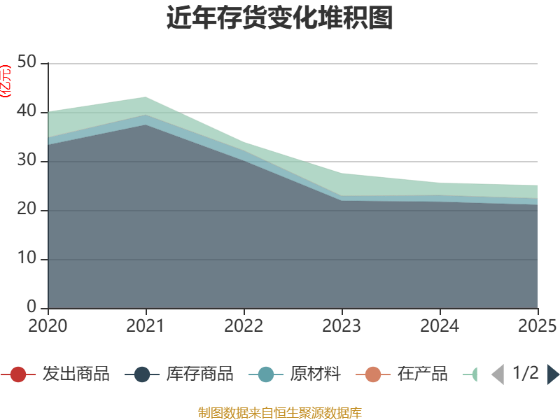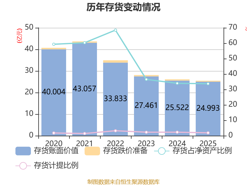从存货变动来看,截至2025年末,公司存货账面价值为24.99亿元,占净资产的33.7%,较上年末减少5289.34万元。其中,存货跌价准备为4708.74万元,计提比例为1.85%。