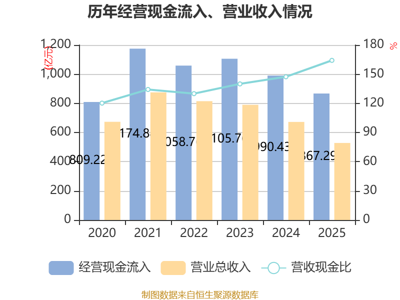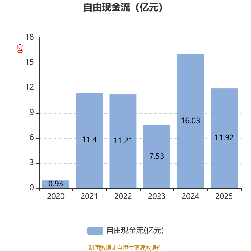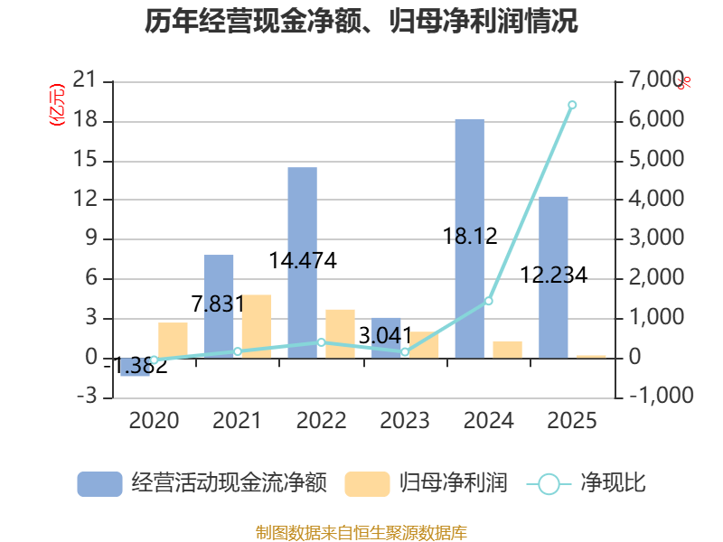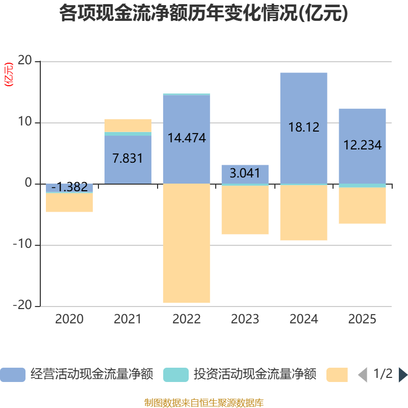 截至2025年,公司经营活动现金流净额为12.23亿元,同比下降32.48%;筹资活动现金流净额-5.89亿元,同比增加3.11亿元;投资活动现金流净额-6476.84万元,上年同期为-2644.8万元。