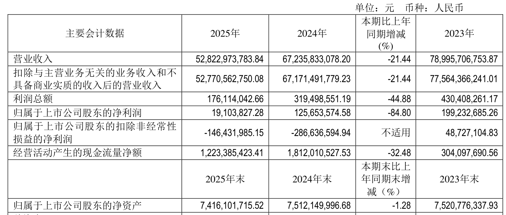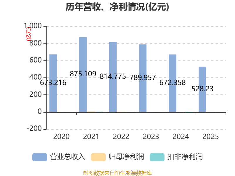 中证智能财讯五矿发展(600058)3月31日披露2025年年度报告。2025年,公司实现营业总收入528.23亿元,同比下降21.44%;归母净利润1910.38万元,同比下降84.80%;扣非净利润亏损1.46亿元,上年同期亏损2.87亿元;经营活动产生的现金流量净额为12.23亿元,同比下降32.48%;报告期内,五矿发展基本每股收益为-0.05元,加权平均净资产收益率为-0.99%。公司2025年度分配预案为:拟向全体股东每10股派现0.336元(含税)。