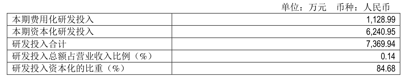 2025年全年,公司研发投入金额为7369.94万元,同比增长53.51%;研发投入占营业收入比例为0.14%,相比上年同期上升0.07个百分点。此外,公司全年研发投入资本化率为84.68%。