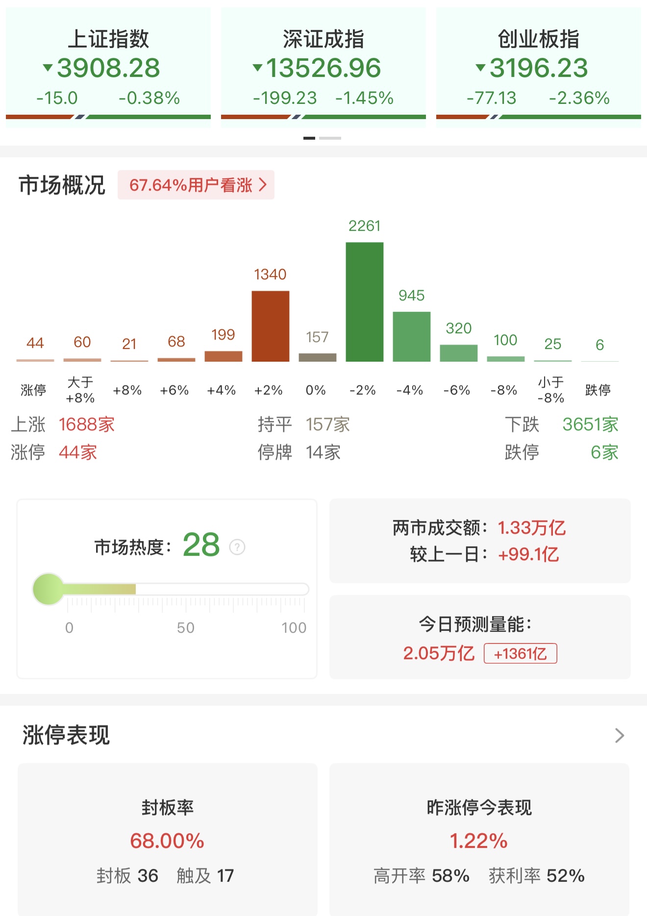 财联社3月31日电,市场早盘冲高回落,三大指数集体翻绿,创业板指跌超2%,深成指、科创50指数均跌超1%。沪深两市半日成交额1.33万亿,较上个交易日放量99亿。盘面上热点较为杂乱,全市场近3700只个股下跌。从板块来看,高铁概念延续强势,神州高铁2连板,金鹰重工20CM涨停。商业航天概念逆势走强,神剑股份走出4连板,再升科技触及涨停创历史新高。福建本地股反复活跃,平潭发展5天3板,闽东电力涨停,闽发铝业2连板。下跌方面,存储芯片概念集体下挫,佰维存储、德明利、香农芯创大跌。截至收盘,沪指跌0.38%,深成指跌1.45%,创业板指跌2.36%。