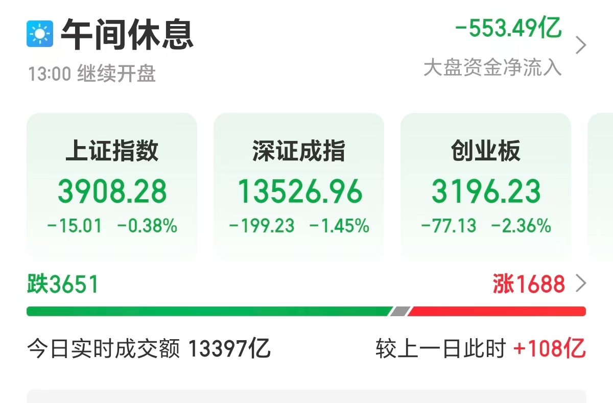 【大河财立方消息】3月31日,市场早盘冲高回落,A股主要指数集体翻绿,创业板指跌超2%,深成指、科创50指数均跌超1%。沪深两市半日成交额1.33万亿,较上个交易日放量99亿。盘面上热点较为杂乱,全市场超3600只个股下跌。