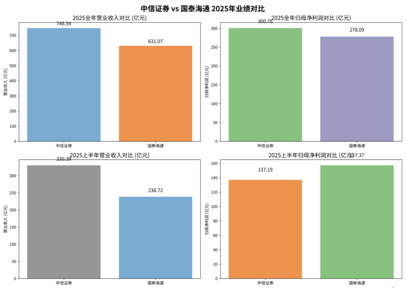 2025年半年报是国泰君安与海通证券合并为国泰海通后的首份半年报,2025年年报则是二者合并后的首份年报。在2025年半年报时,中信证券的归母净利润曾被国泰海通超越,彼时,中信证券半年归母净利润为137.19亿元,比国泰海通少了20.18亿元。