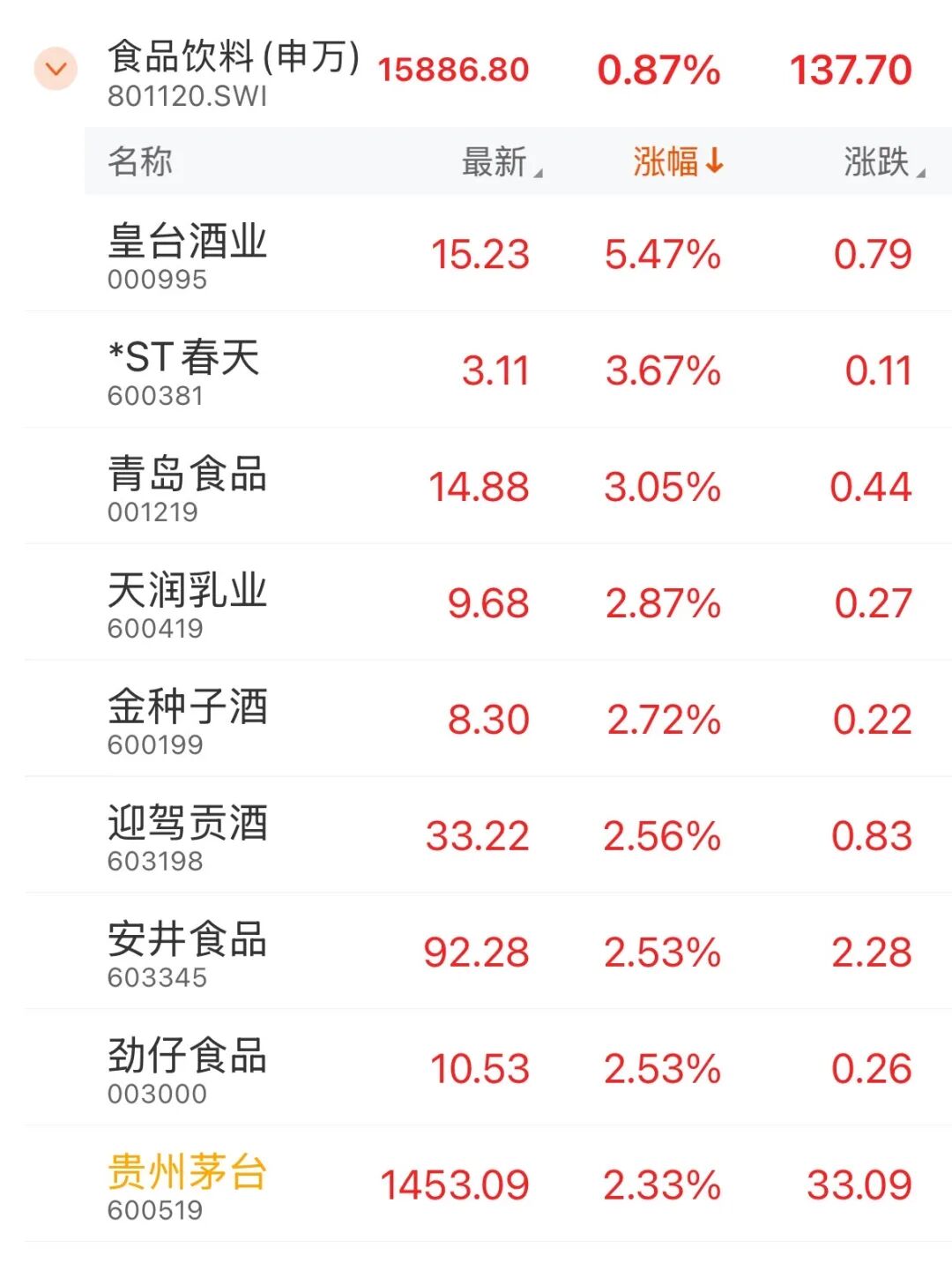 早盘,大消费板块局部回暖。食品饮料、酒类、家电等方向均有所表现。截至午间收盘,美的集团涨超6%,皇台酒业涨超5%;贵州茅台盘中一度涨超4%,午盘收涨2.33%。
