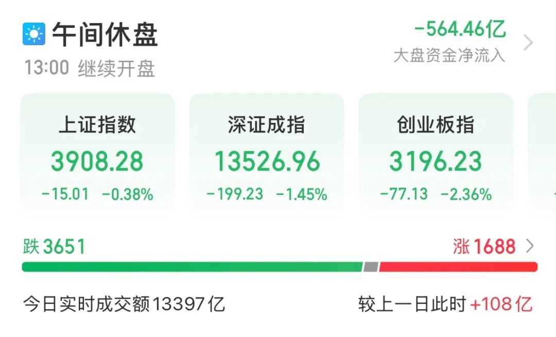 3月31日早盘,A股市场冲高回落。截至午间收盘,上证指数报3908.28点,跌0.38%;深证成指跌1.45%,创业板指跌2.36%,科创综指跌1.88%。沪深北三市半日成交13397亿元。