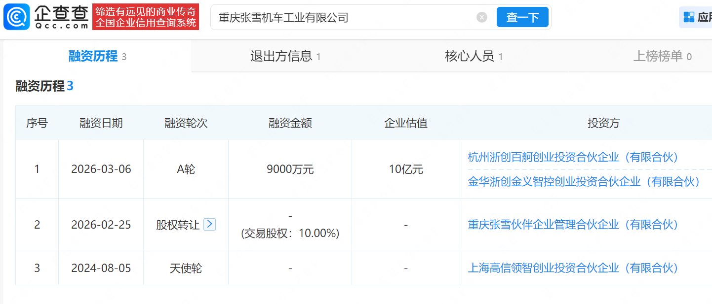 2026年3月初,张雪机车完成A轮融资,投后估值约10.9亿元,本轮投资方金华浙创金义智控创业投资合伙企业(有限合伙)背后,宏昌科技(301008)出资29.82%。