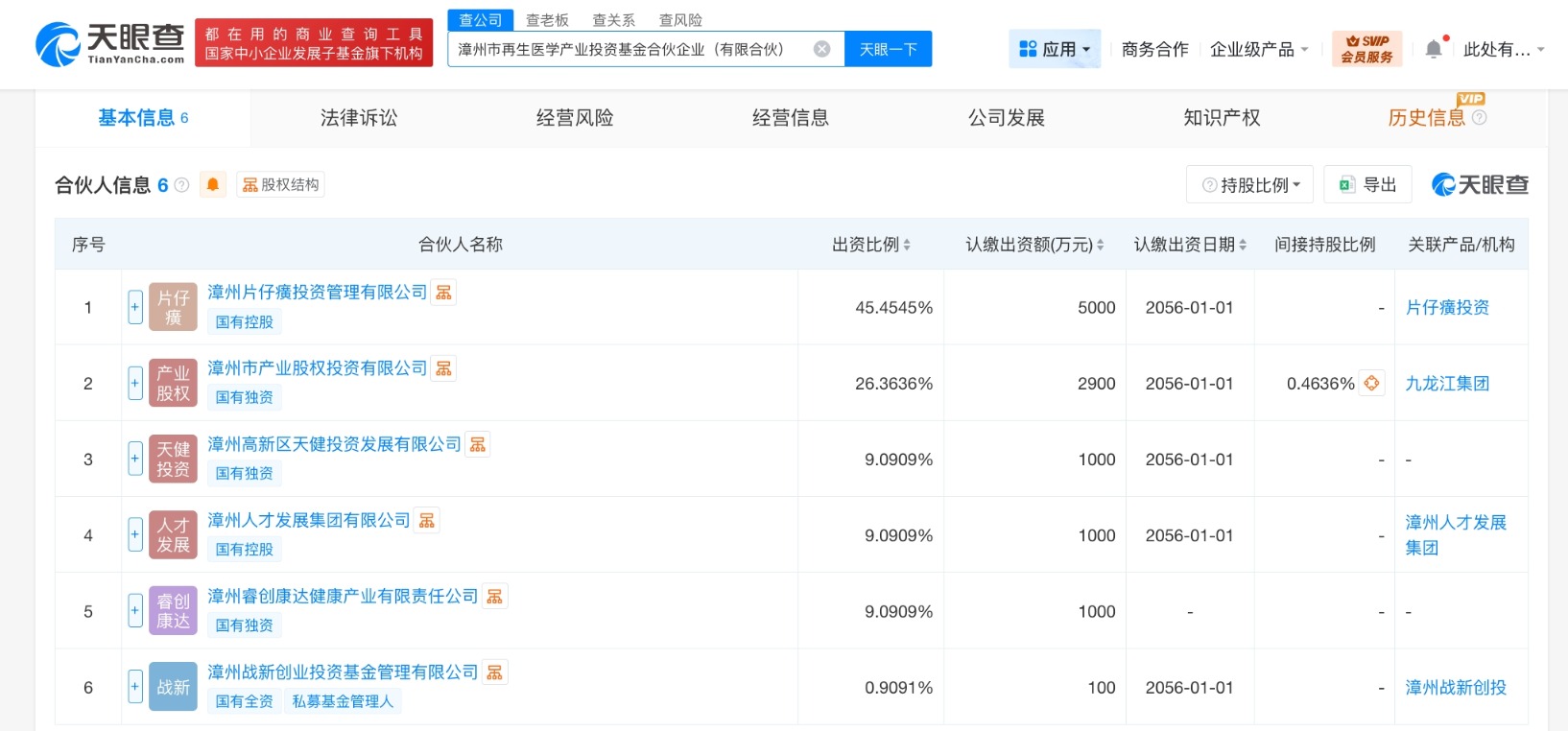 天眼查工商信息显示,近日,漳州市再生医学产业投资基金合伙企业(有限合伙)成立,执行事务合伙人为漳州战新创业投资基金管理有限公司,出资额1.1亿元人民币,经营范围为以私募基金从事股权投资、投资管理、资产管理等活动。合伙人信息显示,该基金由漳州片仔癀投资管理有限公司、漳州市产业股权投资有限公司、漳州高新区天健投资发展有限公司等共同出资。