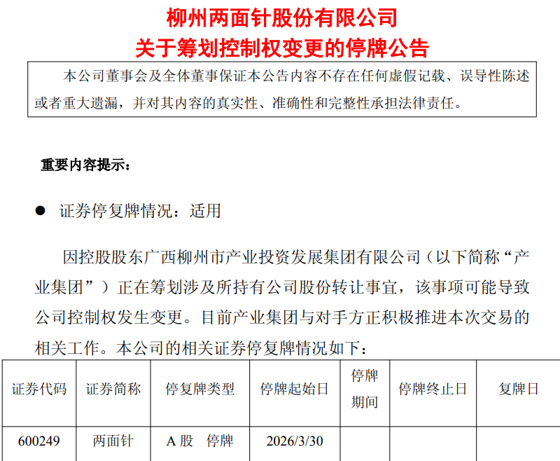 两面针公告显示,其控股股东广西柳州市产业投资发展集团有限公司(以下简称“柳州产业投资集团”)正筹划股份转让,可能导致柳州两面针股份有限公司(下称“两面针”)控制权变更,其股票自3月30日起停牌,预计停牌时间不超过2个交易日。