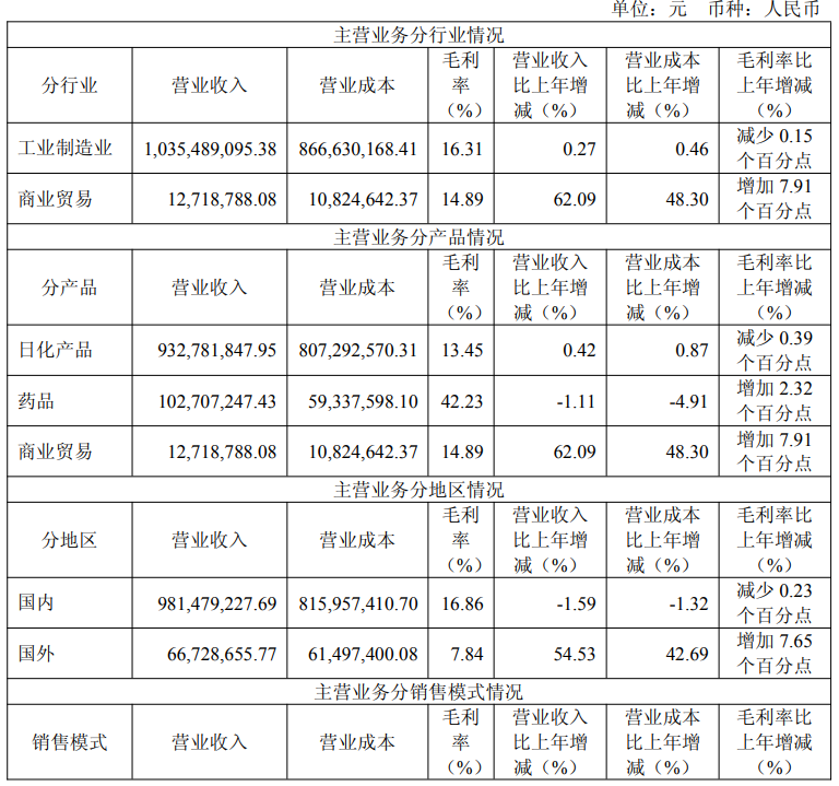 从营收结构看,两面针的日化产品仍贡献了总营收的88%,占比与去年持平。然而,该业务的盈利能力堪忧:其毛利率仅为13.45%,同比下滑0.39个百分点,在三大主业中垫底,且仅为药品业务毛利率的三分之一左右。