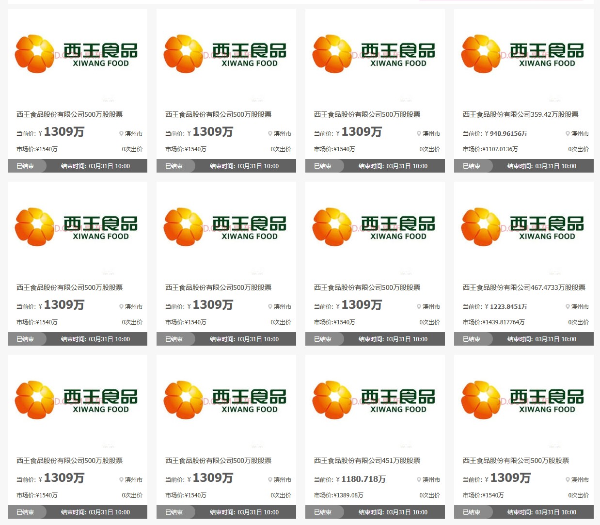 3月30日10时至31日10时,西王食品控股股东西王集团所持2亿股股份在京东司法拍卖平台公开拍卖。然而经过24小时挂牌,无一人出价。