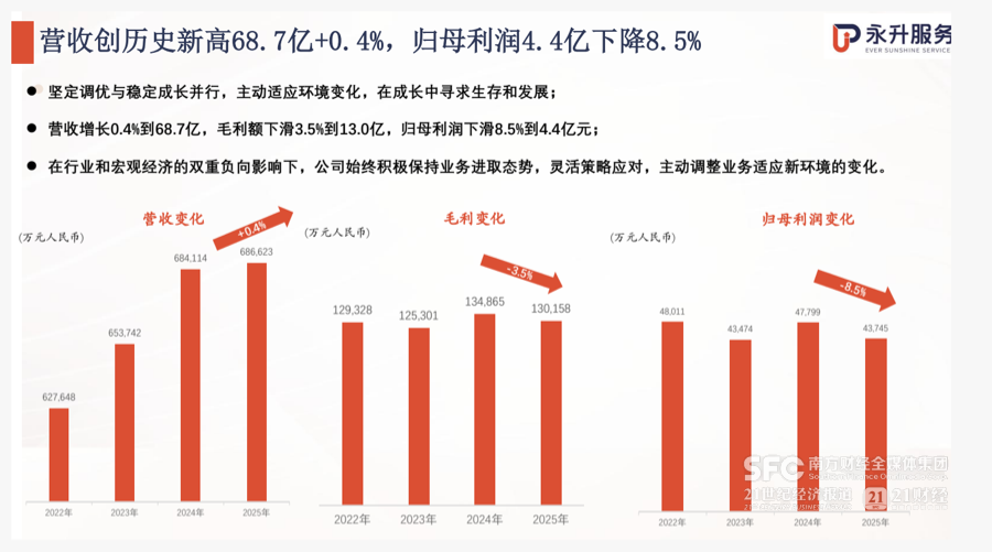 2025年,永升服务规模保持稳定,公司聚焦上海、苏州等70–80个核心城市,在稳步外拓的同时,有序退出约4200万平方米质地不佳的项目。全年实现签约面积3.5亿平方米、在管面积2.5亿平方米,均小幅增长。