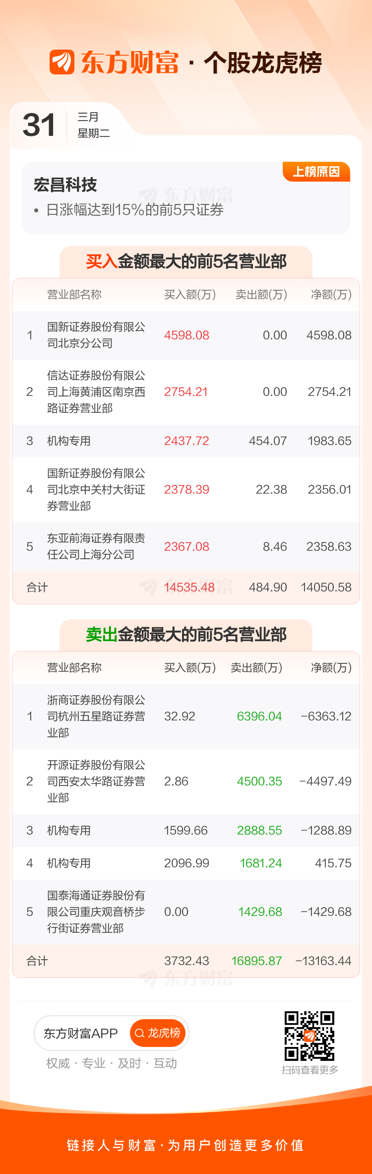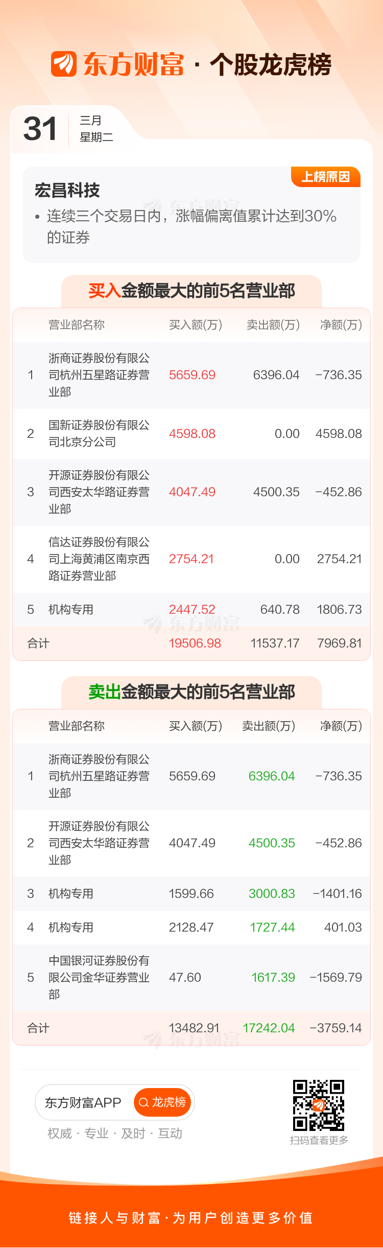 交易所2026年3月31日公布的交易公开信息显示,宏昌科技因成为日涨幅达到15%的前5只证券、连续三个交易日内,涨幅偏离值累计达到30%的证券上榜。宏昌科技当日收报42.29元,涨跌幅20.01%,偏离值20.00%,换手率24.92%,成交额11.59亿。异常期间3月30日至3月31日,期间涨幅43.99%,累计偏离值46.58%,区间成交额14.15亿。