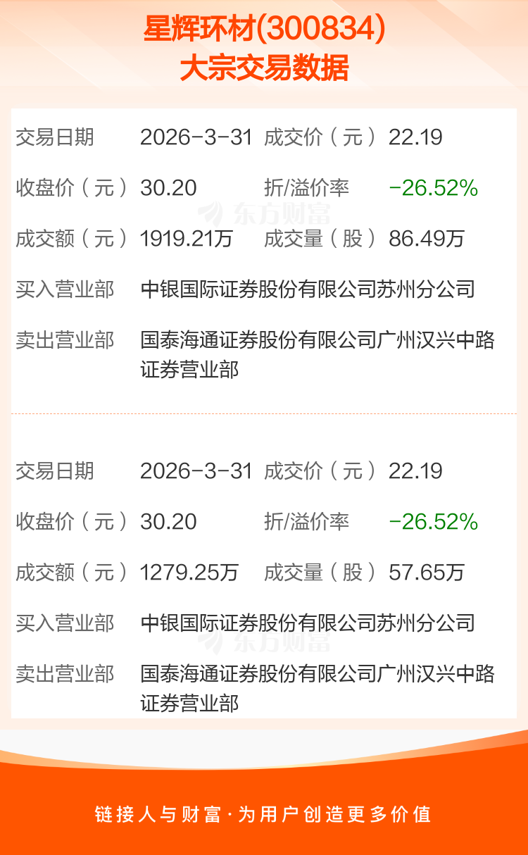 2026年3月31日,星辉环材发生2笔大宗交易,共成交144.14万股,成交金额3198.46万元,占其流通市值比例为0.55%。