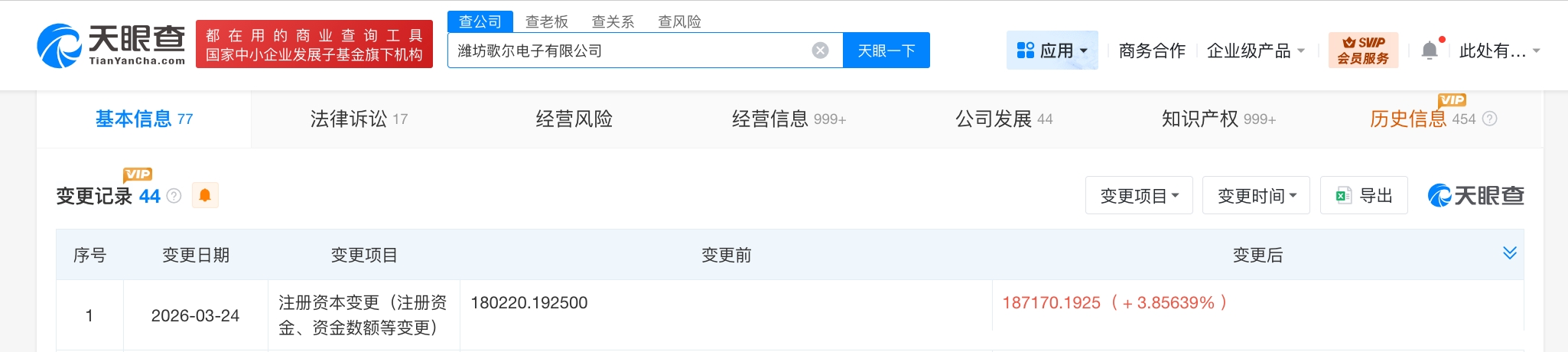 每经AI快讯,天眼查工商信息显示,近日,潍坊歌尔电子有限公司发生工商变更,注册资本由约18亿元人民币增至约18.7亿元人民币。该公司成立于2004年11月,法定代表人为李友波,经营范围包括开发、制造、销售电子产品、通讯产品及配件、音响器材等。股东信息显示,该公司由歌尔股份(002241)、香港歌尔泰克有限公司共同持股。