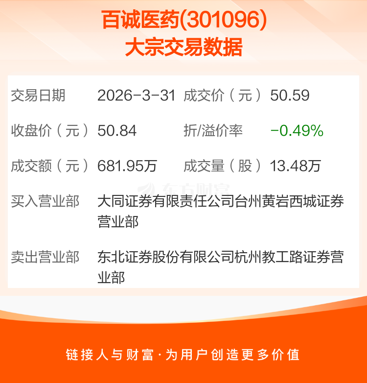 2026年3月31日,百诚医药发生1笔大宗交易,共成交13.48万股,成交金额681.95万元,占其流通市值比例为0.16%。
