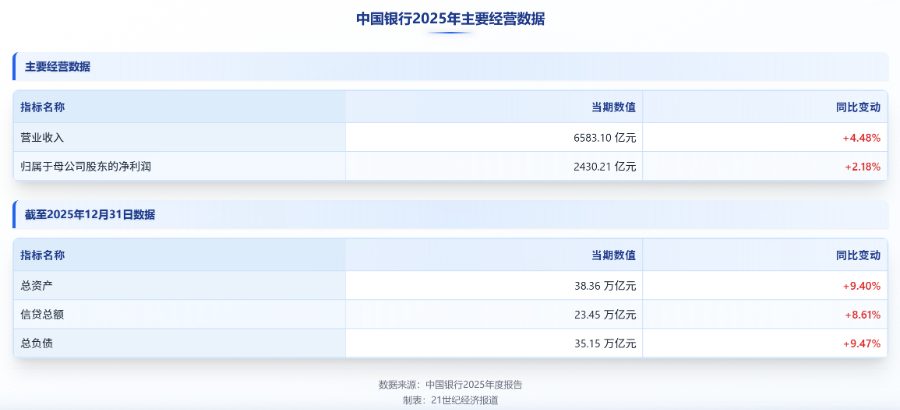 年报数据显示,2025年,中国银行实现营业收入6583.10亿元,同比增长4.48%;归属于母公司股东的净利润2430.21亿元,同比增长2.18%,增速较前三季度进一步提升。