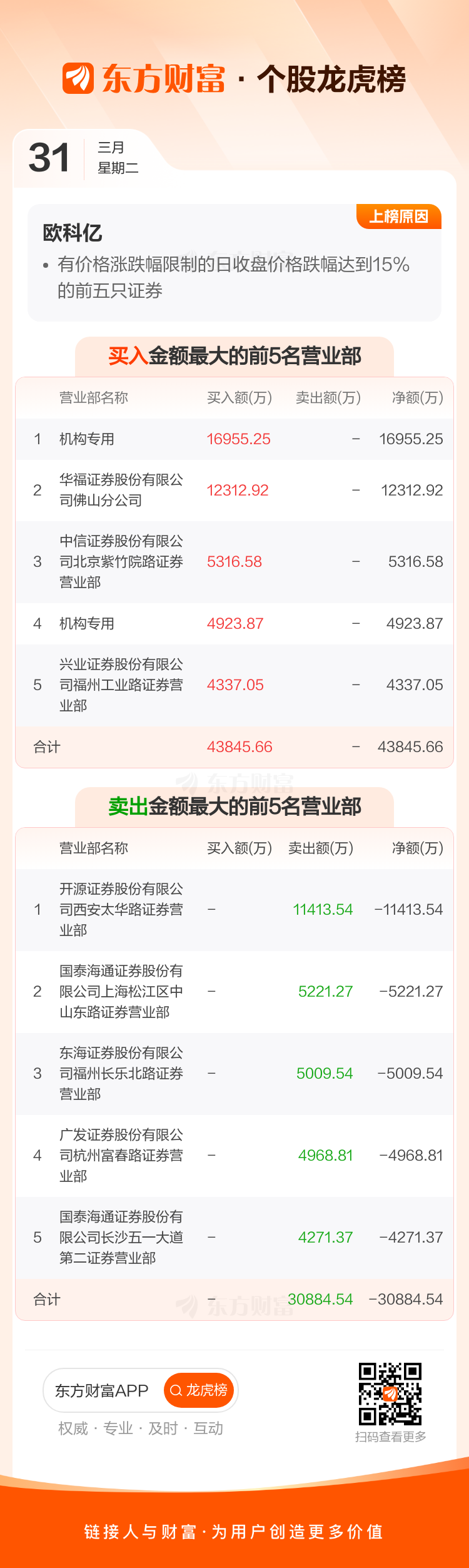 交易所2026年3月31日公布的交易公开信息显示,欧科亿因成为有价格涨跌幅限制的日收盘价格跌幅达到15%的前五只证券上榜。欧科亿当日收报78.22元,涨跌幅-17.65%,偏离值-17.65%,换手率19.35%,成交额25.65亿。